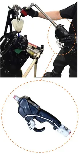 「オイル注入忘れ防止」として、除雪機のギアケースにオイルを注入する際に使用しているオイルガン(プリセットバッチメーター)に弊社のポカヨケ用小型送信機TW-850Tを装着することで、「オイルガンの引き金が引かれたことを検知する」仕組みを開発いたしました。オイル注入の作業性を損なわないよう、オイルガンのブッシング(オイル注入口側)にポカヨケ用小型送信機TW-850Tを取り付ける機構設計を行いました。